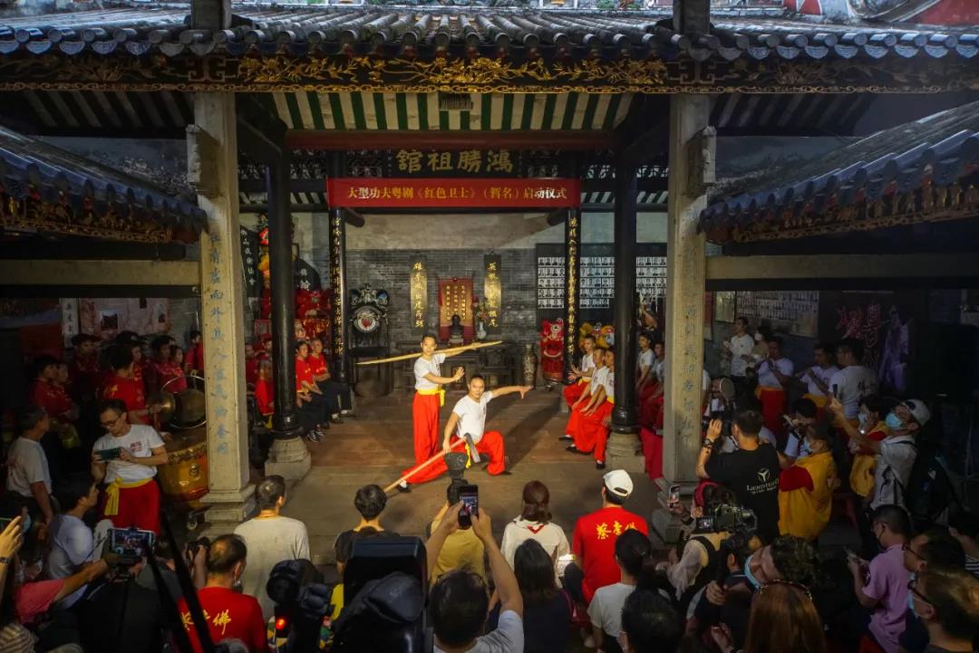 伴随着锣鼓喧天,在古色古香的佛山鸿胜馆,佛山粤剧院演员和蔡李佛弟子带来精彩的锄头功、扁担功等功夫表演,以巧趣点睛、簪花挂红,开启武魂与粤韵创新融合的绚烂篇章,大型功夫粤剧《红色卫士》(暂名)宣告正式启动。